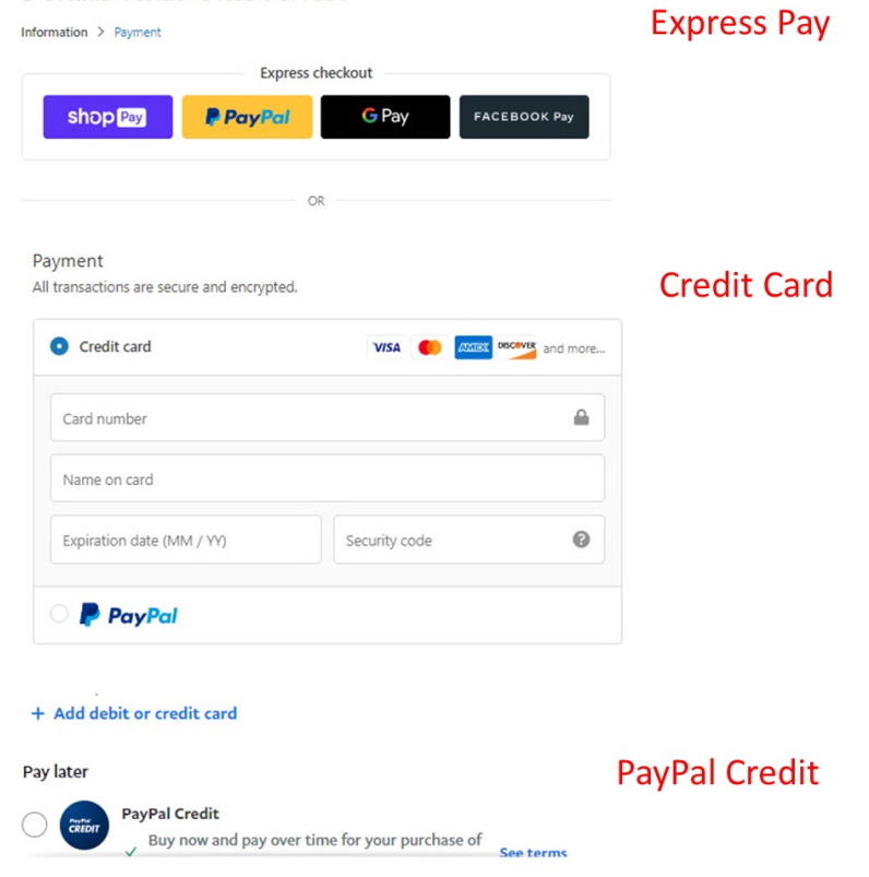 We are using Shopify as our Secure & Encrypted online ordering system and you may pay via: Express Pay, Normal Credit/Debit Card and Extended 6 Months - No Interest thru PayPal Credit.